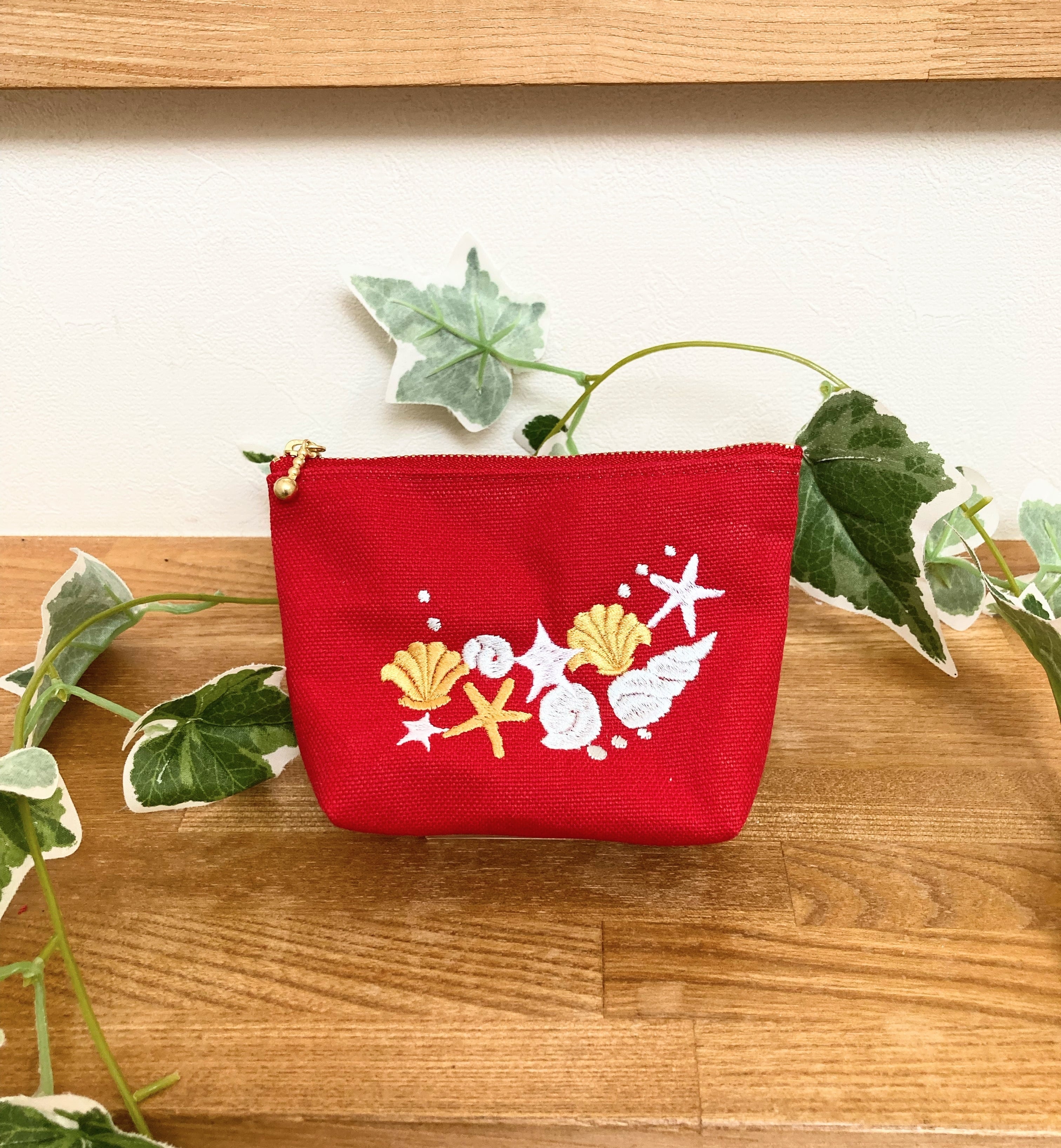 ミシン刺繍を施したミニファスナーポーチです。