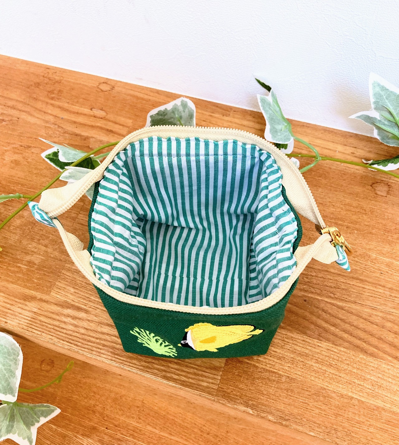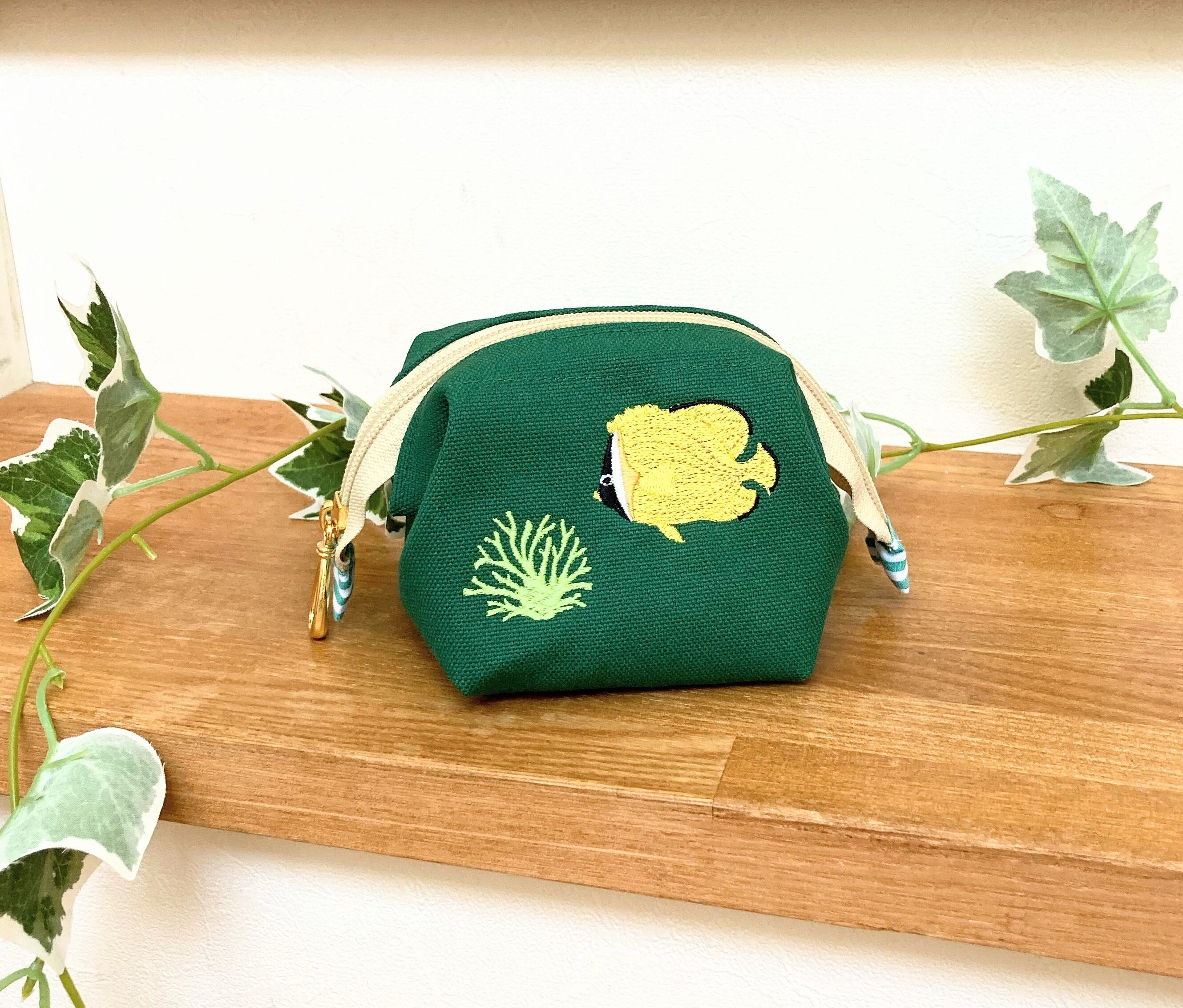 表布は、落ち着いたグリーンの8号帆布を使用し、オリジナルデザインのチョウチョウウオをミシン刺繍で入れました。